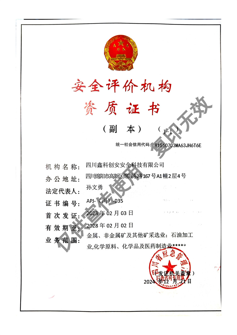 四川鑫科創(chuàng)安安全科技有限公司成立于2020年,是川北地區(qū)取得資質(zhì)的民營安全評價機構(資質(zhì)證書編號:APJ-(川)-035)。并于2022年牽頭成立綜合應急救援隊伍 - 綿陽曙光應急救援中心。